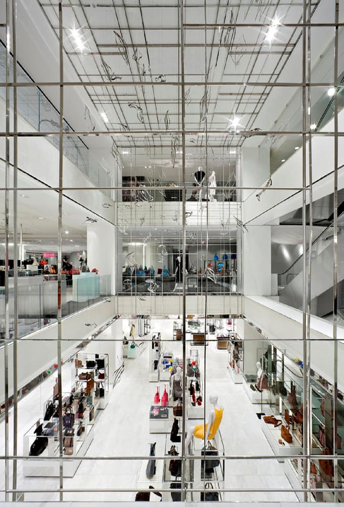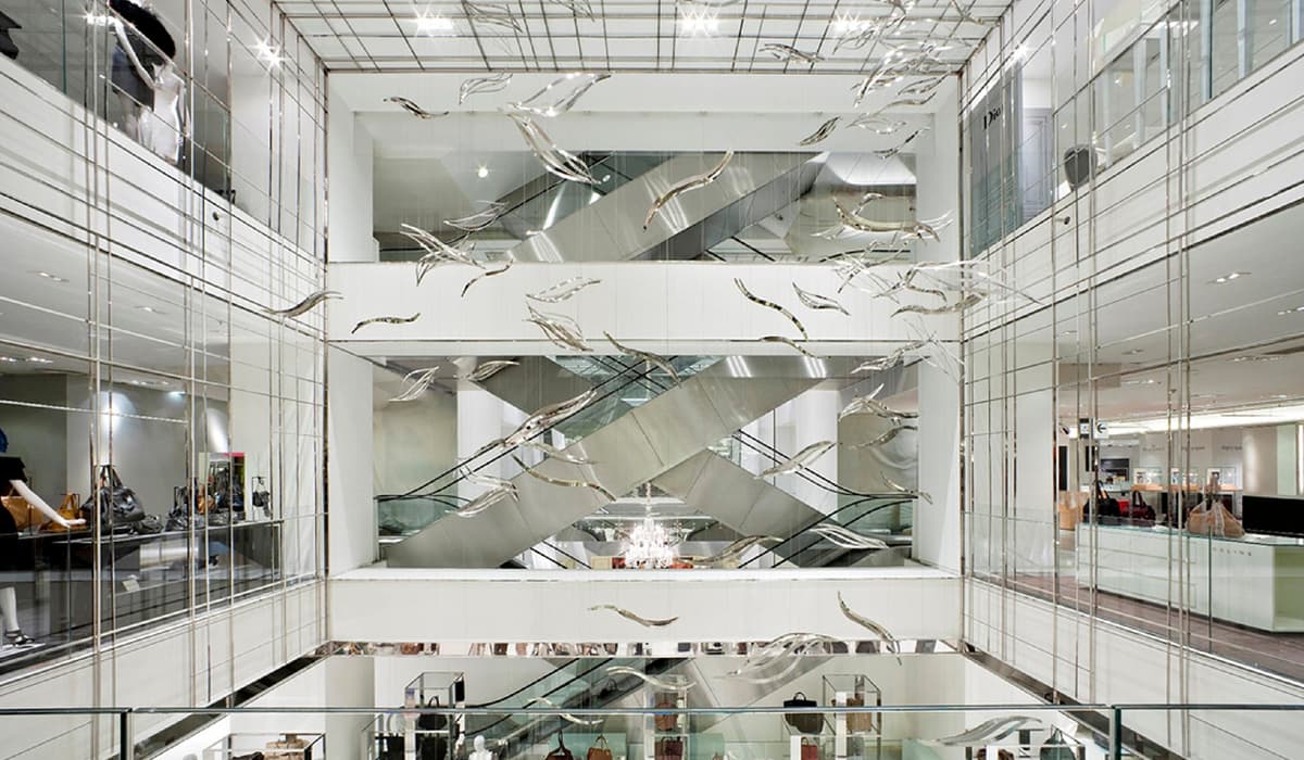 Laser cut stainless steel plate is suspended by piano wire from the ceiling, height, placement, such as a tilt has been adjusted in the field, it has been drifting to the wide space of the atrium of Paris’s oldest department store. This is a world-famous objects that have been published in various national and international industry magazine.